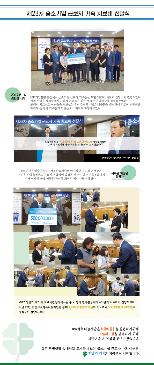 2017년 상반기 제23차 치료비전달식에서는 총 91명의 환자분들에게 총6억원의 치료비가 전달되었다.