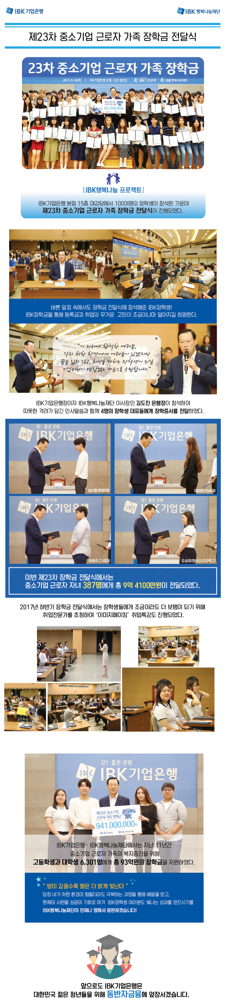 IBK기업은행/IBK행복나눔재단에서는 지난 11년간 중소기업근로자 가족의 복지증진을 위해 고등학생과 대학생 6,301명에게 총 93역원의 장학금을 지원하였다.