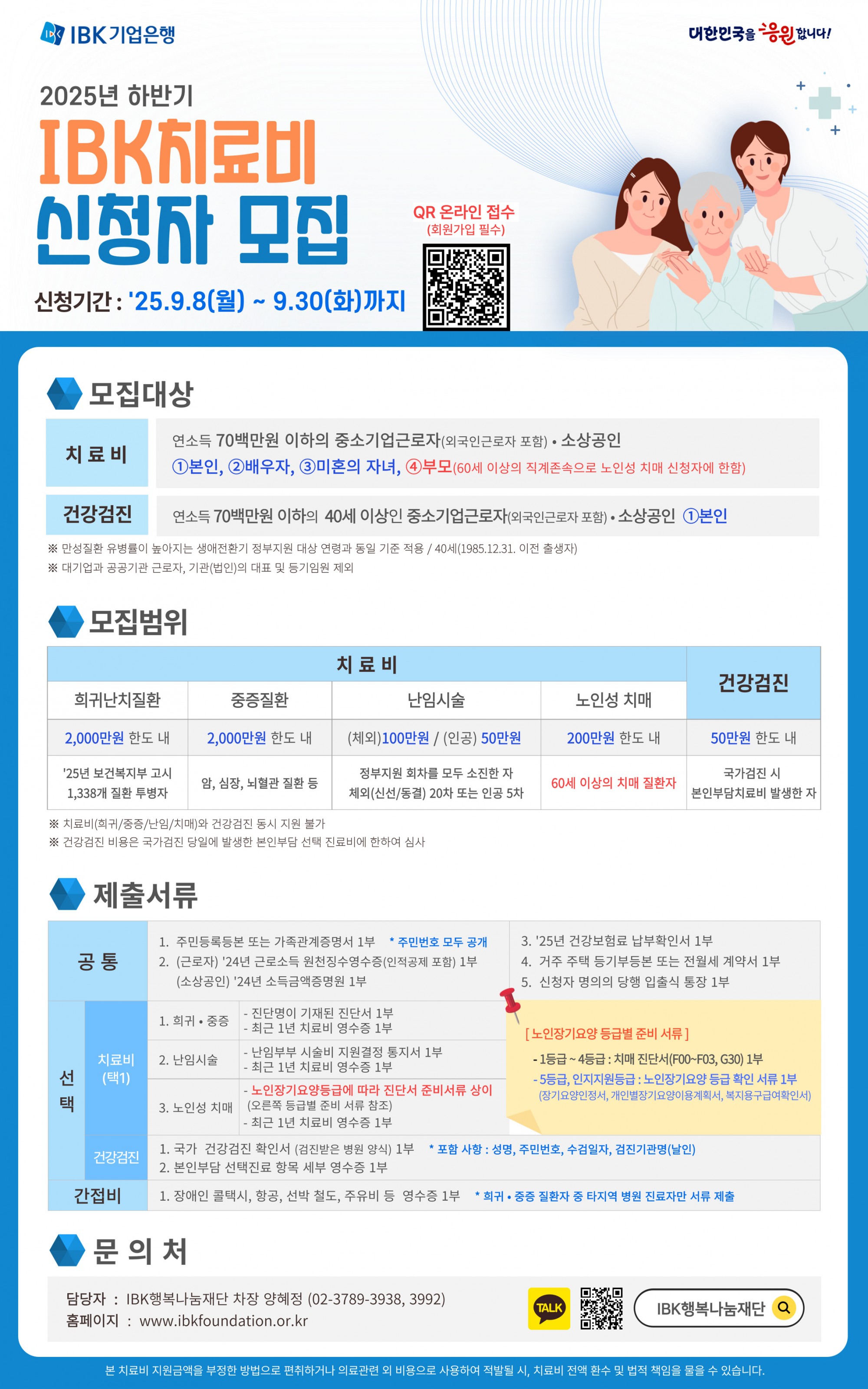 IBK 행복나눔재단 재단소개 재단소개 진정성 있는 나눔 실현을 위해 다양한 사회공헌 활동 수행 인사말 소개 연혁 이사진 조직구성 투명경영 재정보고 경영보고 규정 찾아오시는 길 주요사업 주요사업 진정성 있는 나눔 실현을 위해 다양한 사회공헌 활동 수행 IBK장학금 IBK치료비 IBK중소기업 공동직장어린이집 1호점(남동사랑) 2호점(구미사랑) IBK멘토링 IBK희망기부 IBK인재육성 프로젝트 IBK문화예술지원 IBK희망디자인 IBK희망나래 IBK다문화 사랑 IBK금융경제교육 IBK아이돌봄지원사업 기타사업 소식 소식 진정성 있는 나눔 실현을 위해 다양한 사회공헌 활동 수행 공지사항 언론보도 자료실 자료실 진정성 있는 나눔 실현을 위해 다양한 사회공헌 활동 수행 영상 사진 서식자료 FAQ 감사인사 감사인사 진정성 있는 나눔 실현을 위해 다양한 사회공헌 활동 수행 감사인사 로그인 | 회원가입 카테고리 공지사항 IBK행복나눔재단에서 알려드립니다. H 소식 재단소개 주요사업 소식 자료실 감사인사 공지사항 공지사항 언론보도 2025년 하반기 IBK치료비 지원사업 시행 2025-09-08 IBK행복나눔재단 조회수 : 1487 IBK치료비 신청하기 (근로자 및 소상공인 본인이 직접 홈페이지 회원가입 후 신청 / 타인에 의한 대리 접수 불가) 이전글 2026 IBK구미사랑어린이집 원아 모집(9/8 ~ 9/17) 다음글 IBK아이돌봄지원사업 지원대상 모집 목록 비밀번호확인 * 확인