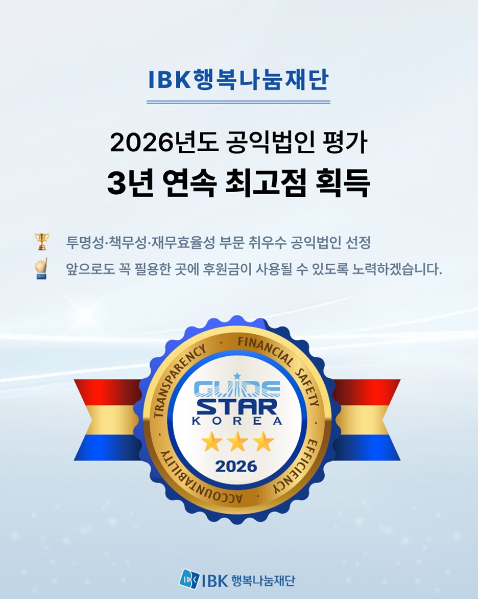 IBK행복나눔재단은 한국가이드스타에서 개발한 공익법인 평가에서 3년 연속 최고점인 별 3개를 획득하였습니다.