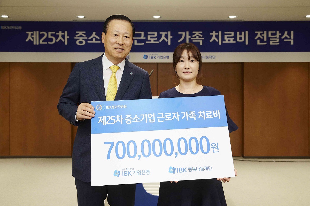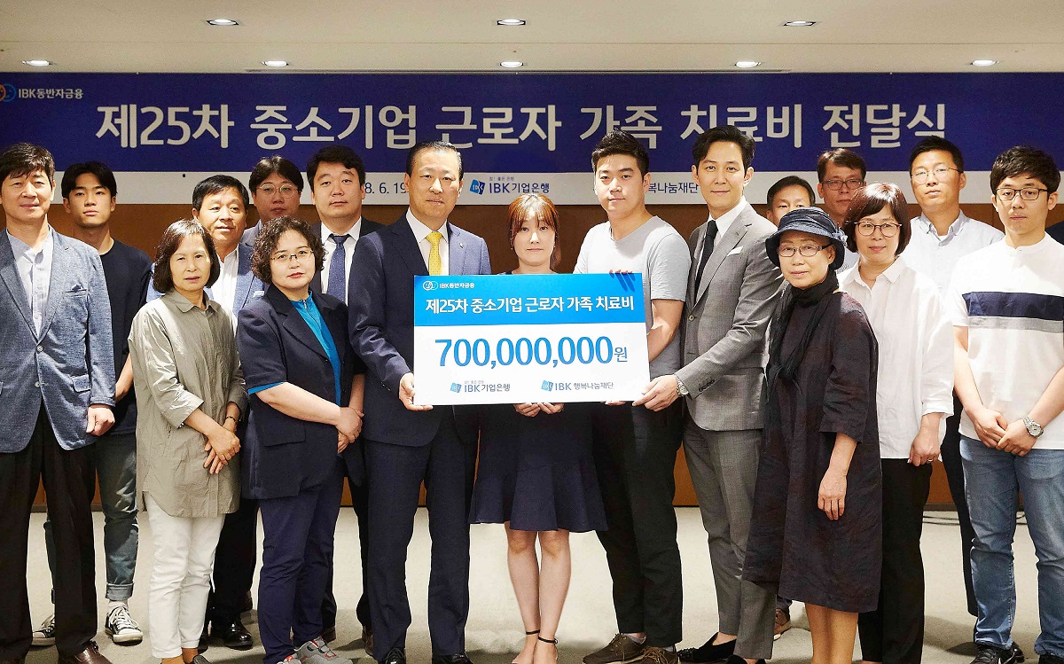 이날 김도진 은행장과 기업은행 임직원이 참석한 가운데 중소기업 근로자 가족 105명에게 7억원의 치료비를 전달하였습니다.