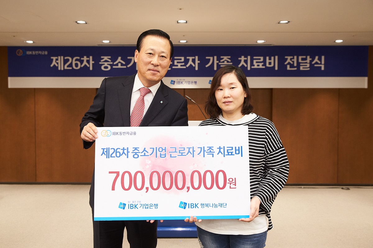 전달식에는 김도진 은행장, 임상현 전무이사, 임종성 감사를 비롯한 각 그룹별 부행장들이 참석하여 고액의 치료비로 어려움에 처한 중소기업 근로자 가족에게 7억 원의 치료비를 전달하였습니다.