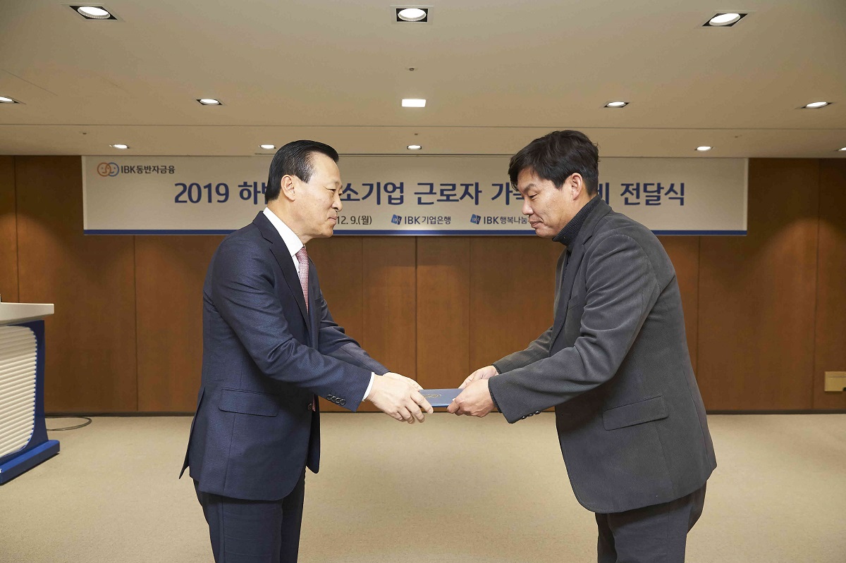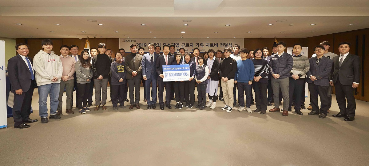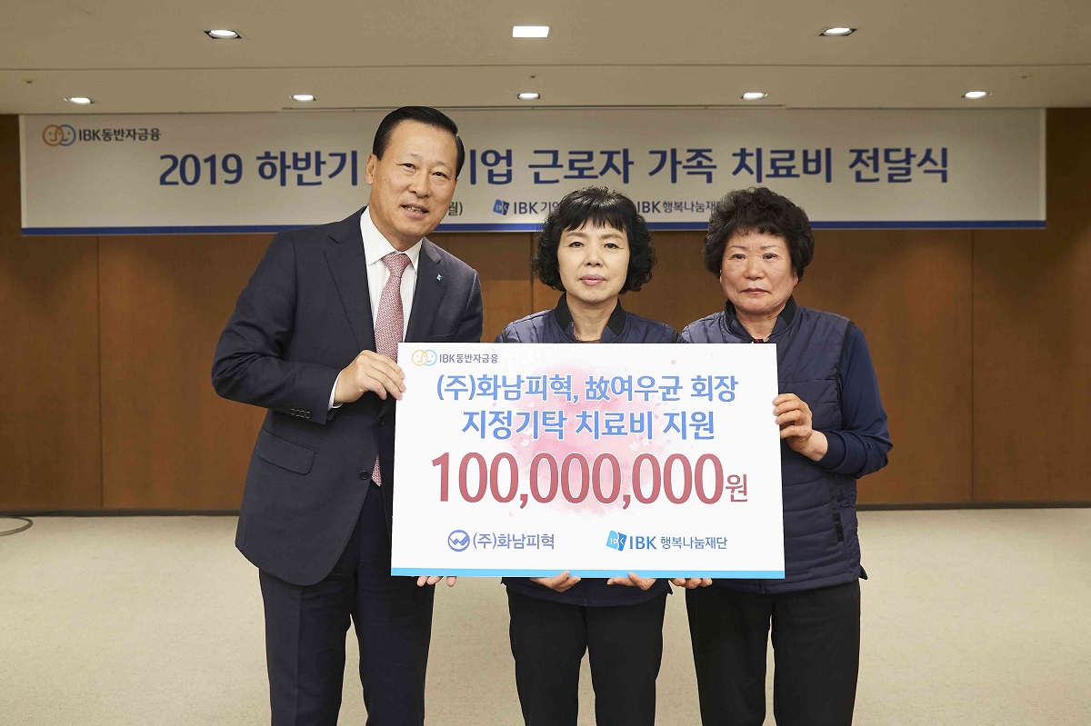 2019년 12월 9일 10시 기업은행 을지로 본점에서 IBK치료비 전달식을 갖고 희귀난치성 질환을 앓고 있는 중기 근로자 가족 162명에게 치료비 6억원을 전달하였다.