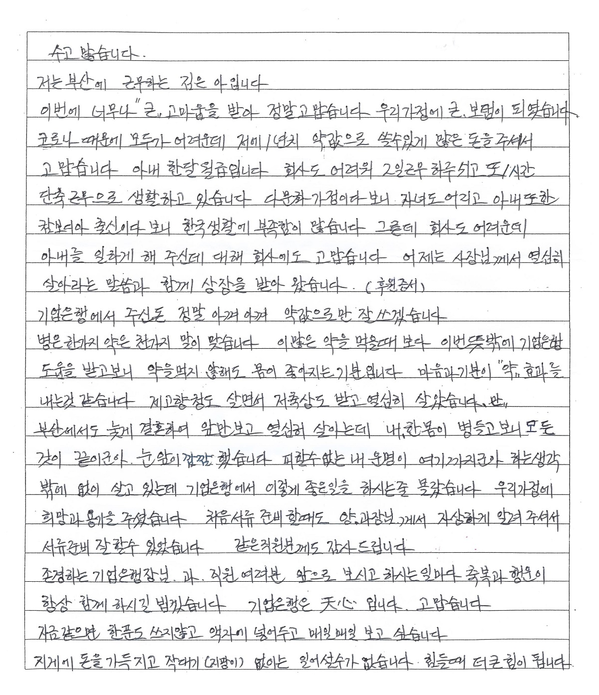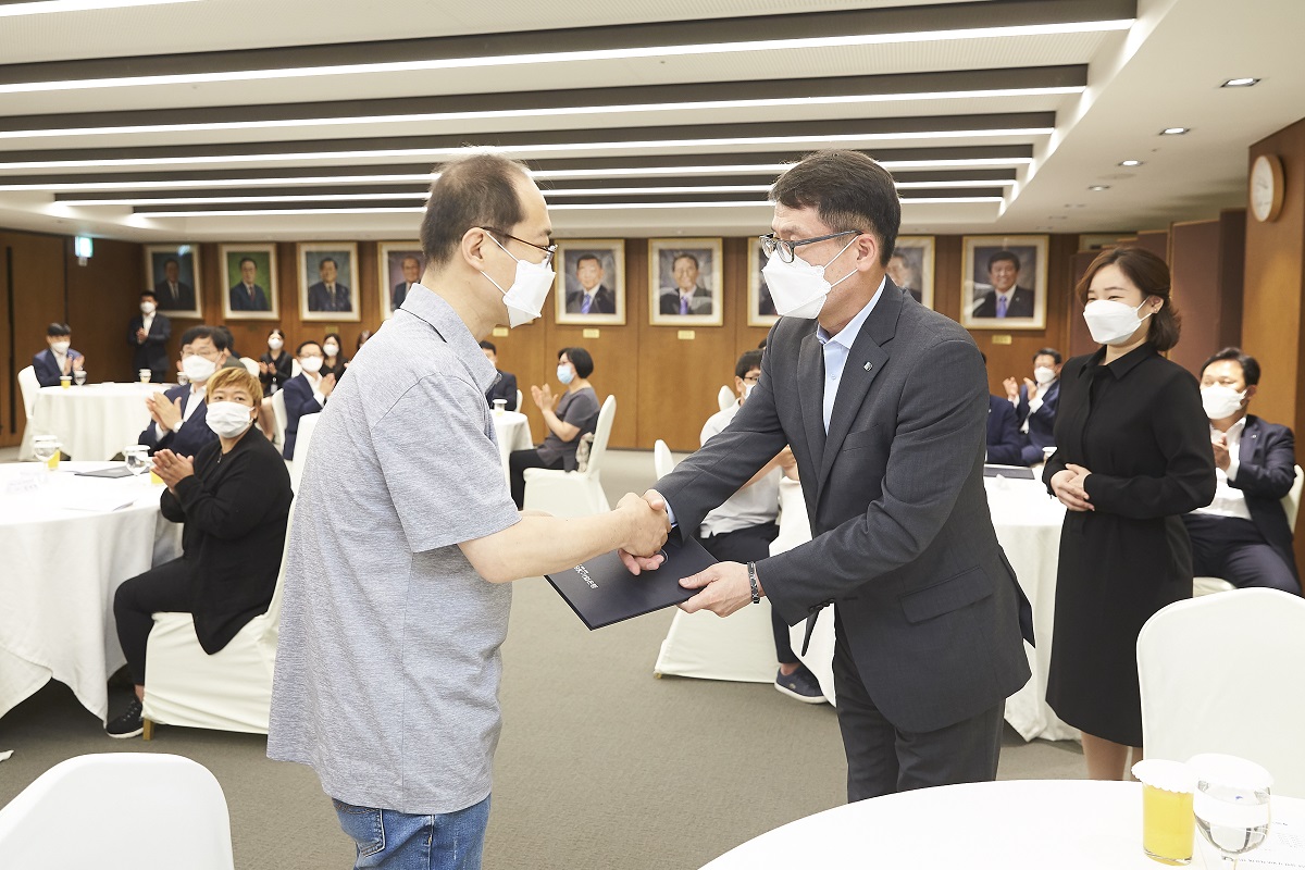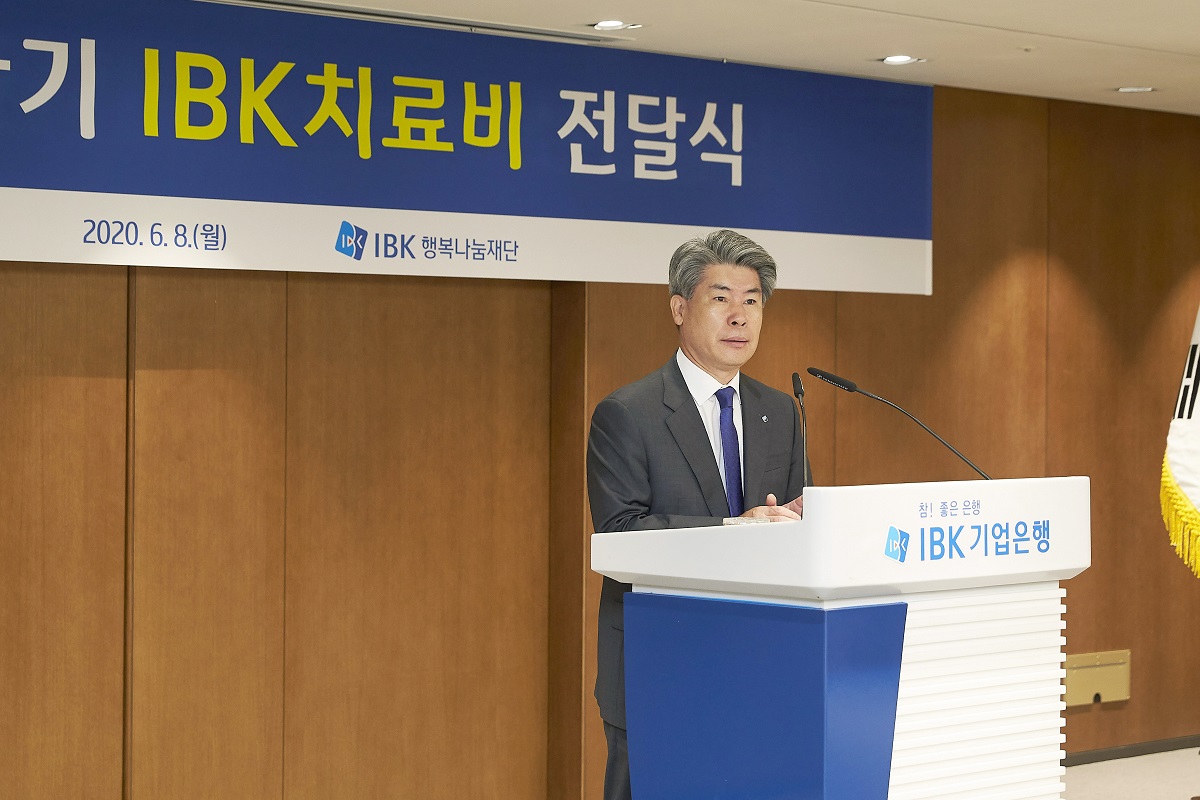 윤종원 은행장과 임원들은 이번 치료비 전달식에 더 많은 중소기업 근로자 가족을 지원하고자 자발적 기부를 통해 재원마련에 동참했다.