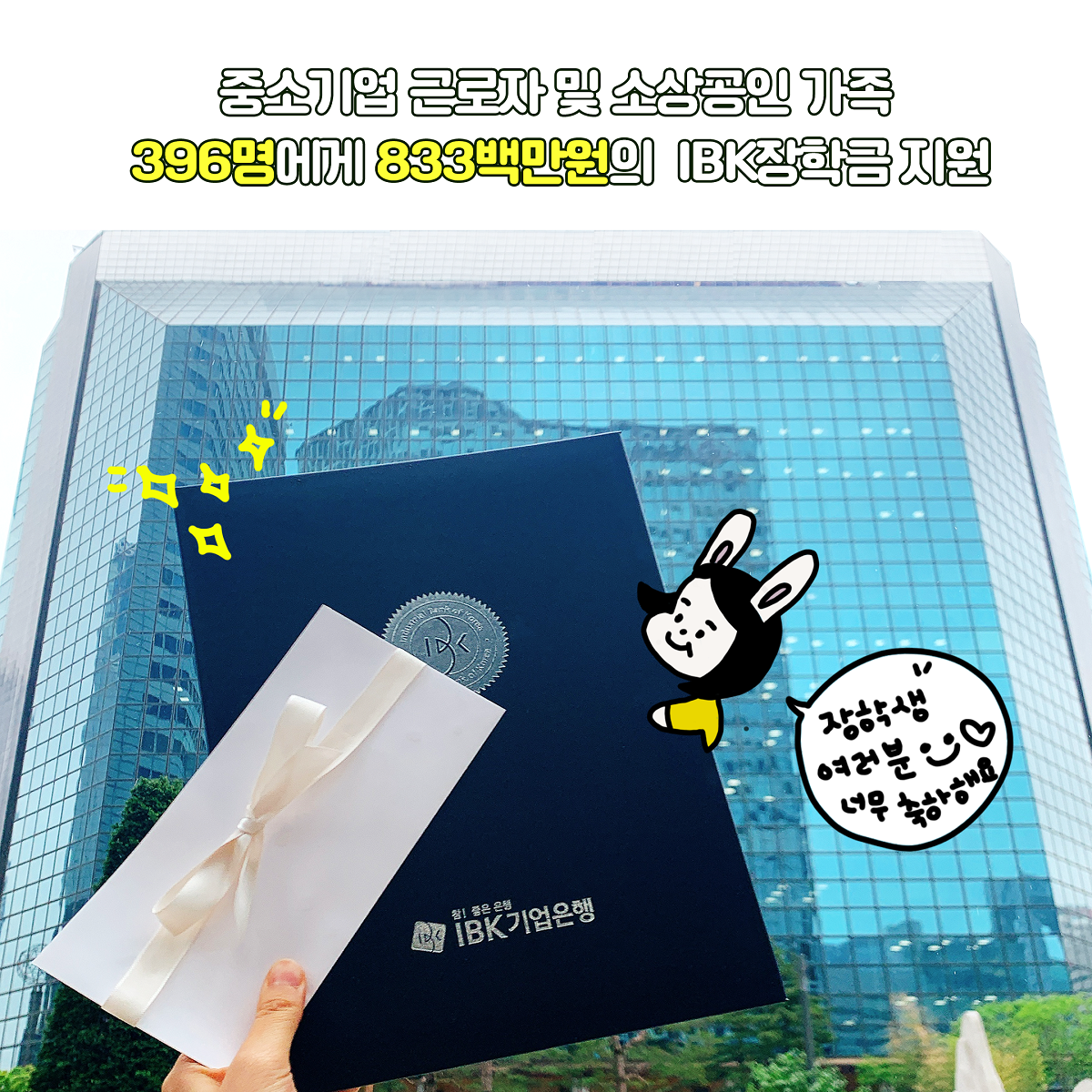 중소기업 근로자 및 소상공인 가족 396명의 학생들에게 833백만원의 IBK장학금이 전달되었습니다!
