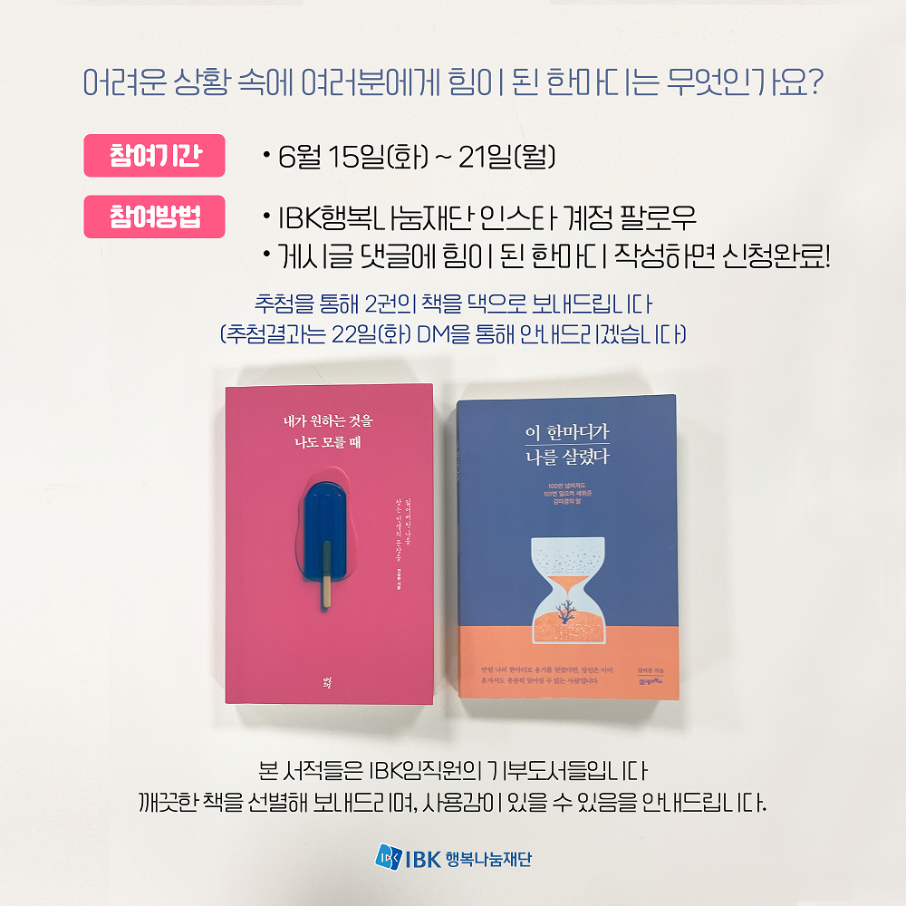 IBK 행복나눔재단 재단소개 재단소개 진정성 있는 나눔 실현을 위해 다양한 사회공헌 활동 수행 인사말 소개 연혁 이사진 조직구성 투명경영 재정보고 경영보고 규정 찾아오시는 길 주요사업 주요사업 진정성 있는 나눔 실현을 위해 다양한 사회공헌 활동 수행 IBK장학금 IBK치료비 IBK중소기업 공동직장어린이집 1호점(남동사랑) 2호점(구미사랑) IBK멘토링 IBK희망기부 IBK인재육성 프로젝트 IBK문화예술지원 IBK희망디자인 IBK희망나래 IBK다문화 사랑 IBK금융경제교육 IBK아이돌봄지원사업 기타사업 소식 소식 진정성 있는 나눔 실현을 위해 다양한 사회공헌 활동 수행 공지사항 언론보도 자료실 자료실 진정성 있는 나눔 실현을 위해 다양한 사회공헌 활동 수행 영상 사진 서식자료 FAQ 감사인사 감사인사 진정성 있는 나눔 실현을 위해 다양한 사회공헌 활동 수행 감사인사 로그인 | 회원가입 카테고리 사진 IBK행복나눔재단의 활동 사진입니다. H 자료실 재단소개 주요사업 소식 자료실 감사인사 사진 영상 사진 서식자료 FAQ 행복한 도서나눔 2021-06-15 가비아 조회수 : 364 이전글 행복한 도서나눔 다음글 2021년 하반기 IBK멘토링 모집 목록 비밀번호확인 * 확인