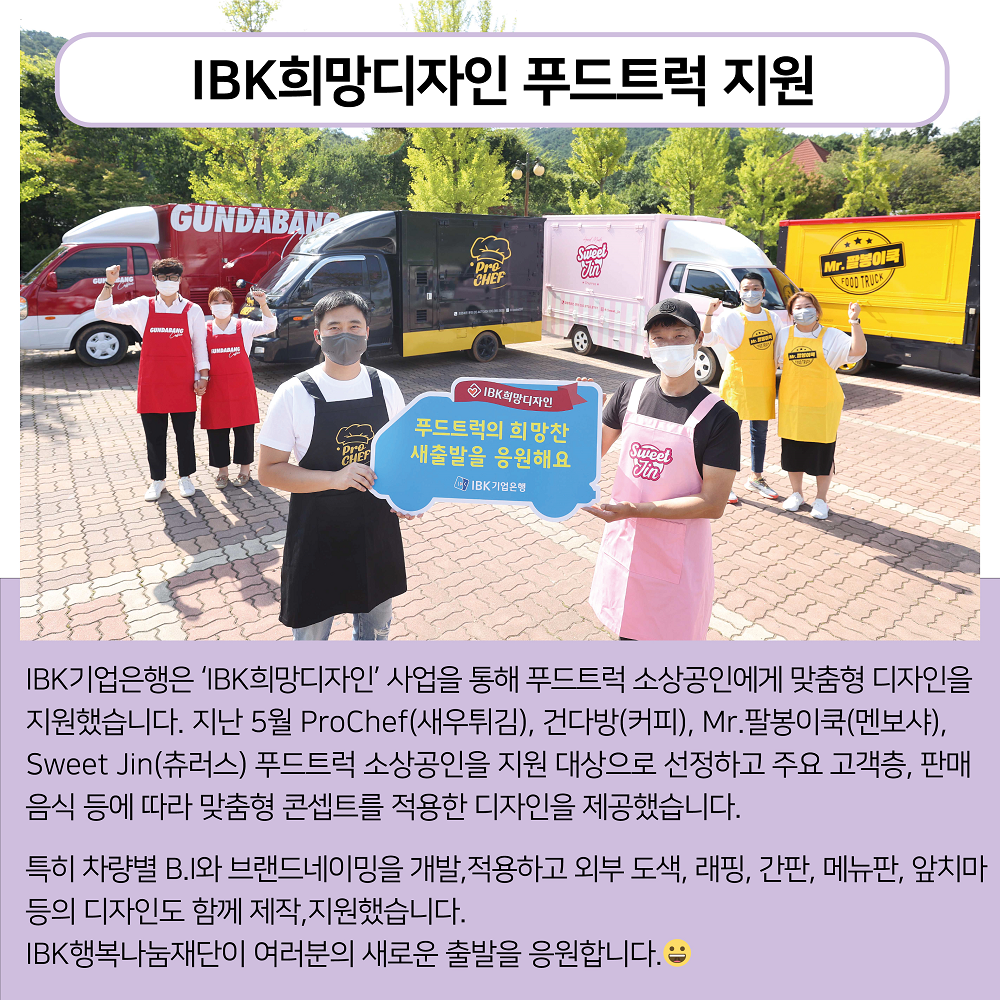 IBK기업은행은 ‘IBK희망디자인’ 사업을 통해 푸드트럭 소상공인에게 맞춤형 디자인을 지원했습니다. 지난 5월 ProChef(새우튀김), 건다방(커피), Mr.팔봉이쿡(멘보샤),