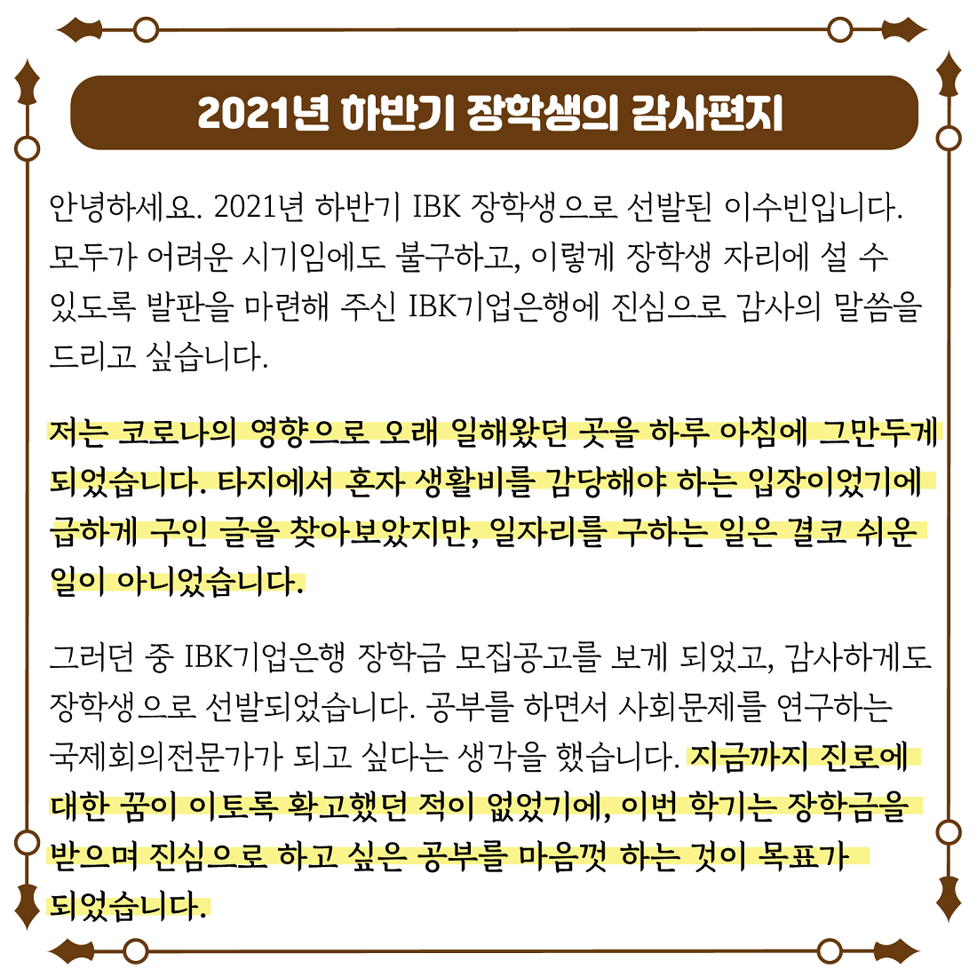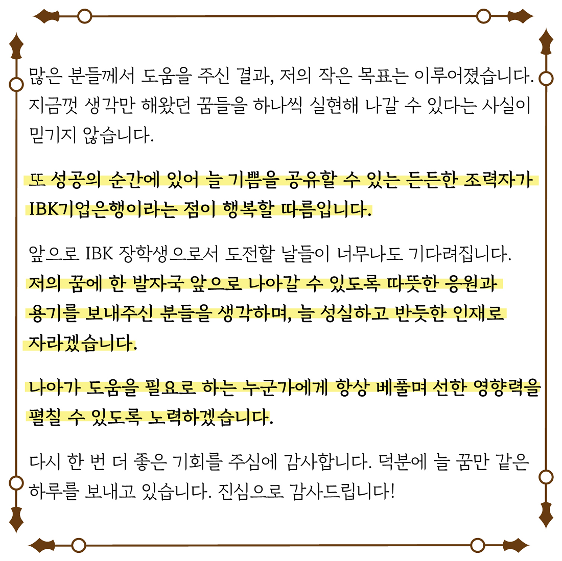 앞으로 IBK 장학생으로서 도전할 날들이 너무나도 기다려집니다.