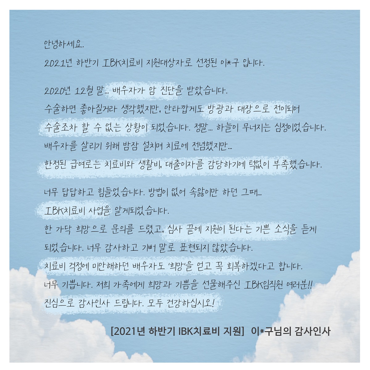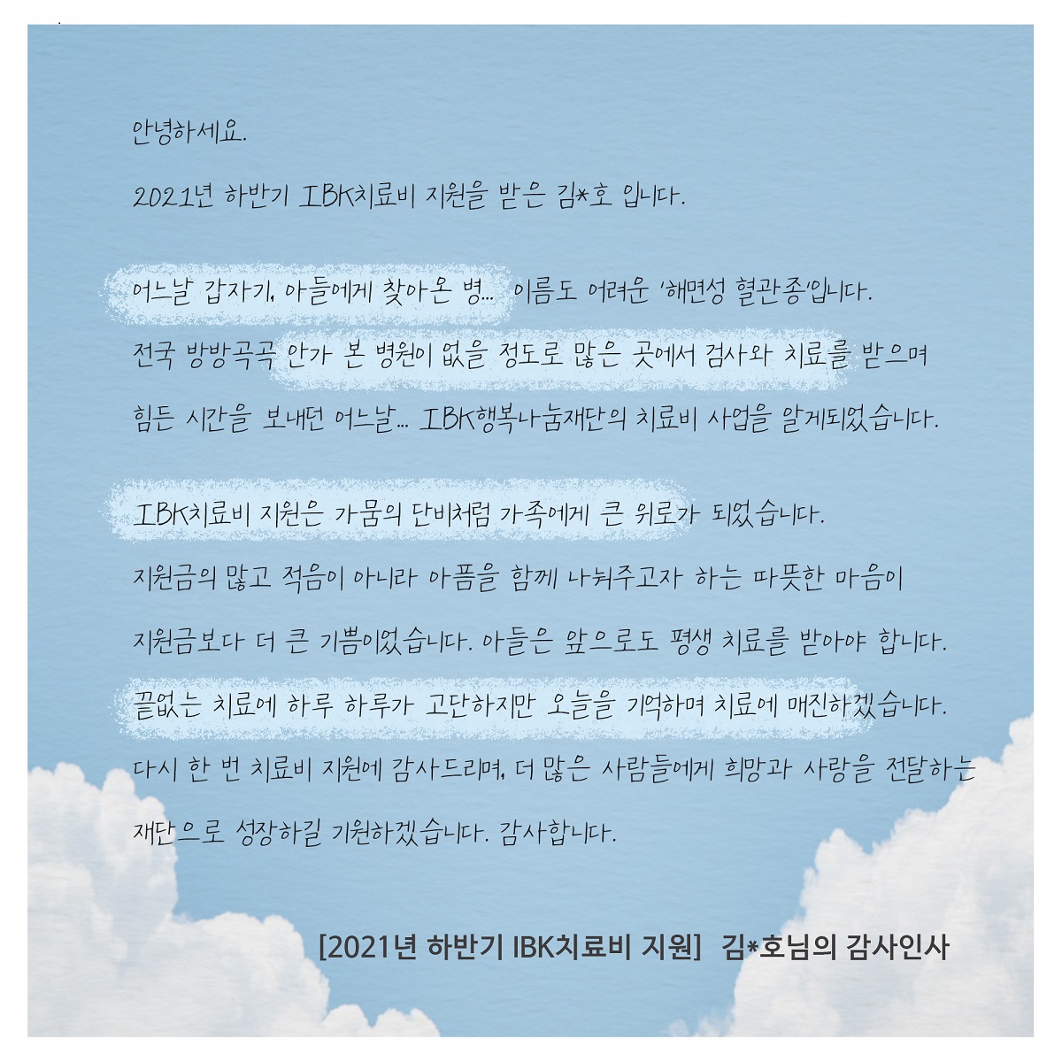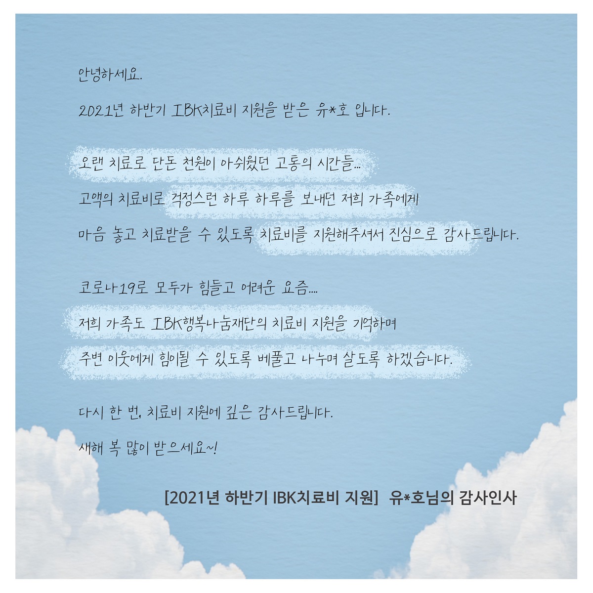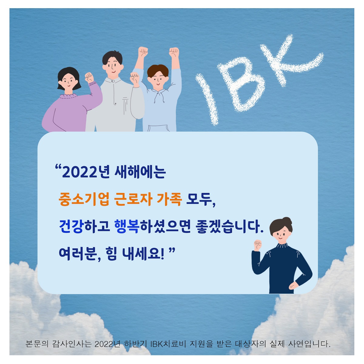 IBK 행복나눔재단 재단소개 재단소개 진정성 있는 나눔 실현을 위해 다양한 사회공헌 활동 수행 인사말 소개 연혁 이사진 조직구성 투명경영 재정보고 경영보고 규정 찾아오시는 길 주요사업 주요사업 진정성 있는 나눔 실현을 위해 다양한 사회공헌 활동 수행 IBK장학금 IBK치료비 IBK중소기업 공동직장어린이집 1호점(남동사랑) 2호점(구미사랑) IBK멘토링 IBK희망기부 IBK인재육성 프로젝트 IBK문화예술지원 IBK희망디자인 IBK희망나래 IBK다문화 사랑 IBK금융경제교육 IBK아이돌봄지원사업 기타사업 소식 소식 진정성 있는 나눔 실현을 위해 다양한 사회공헌 활동 수행 공지사항 언론보도 자료실 자료실 진정성 있는 나눔 실현을 위해 다양한 사회공헌 활동 수행 영상 사진 서식자료 FAQ 감사인사 감사인사 진정성 있는 나눔 실현을 위해 다양한 사회공헌 활동 수행 감사인사 로그인 | 회원가입 카테고리 사진 IBK행복나눔재단의 활동 사진입니다. H 자료실 재단소개 주요사업 소식 자료실 감사인사 사진 영상 사진 서식자료 FAQ IBK치료비 감사인사 2022-01-12 가비아 조회수 : 405 이전글 [IBK멘토링] 2022 IBK멘토링 하반기 대학생 멘토 모집 다음글 2022년 상반기 IBK장학금 전달식 목록 비밀번호확인 * 확인