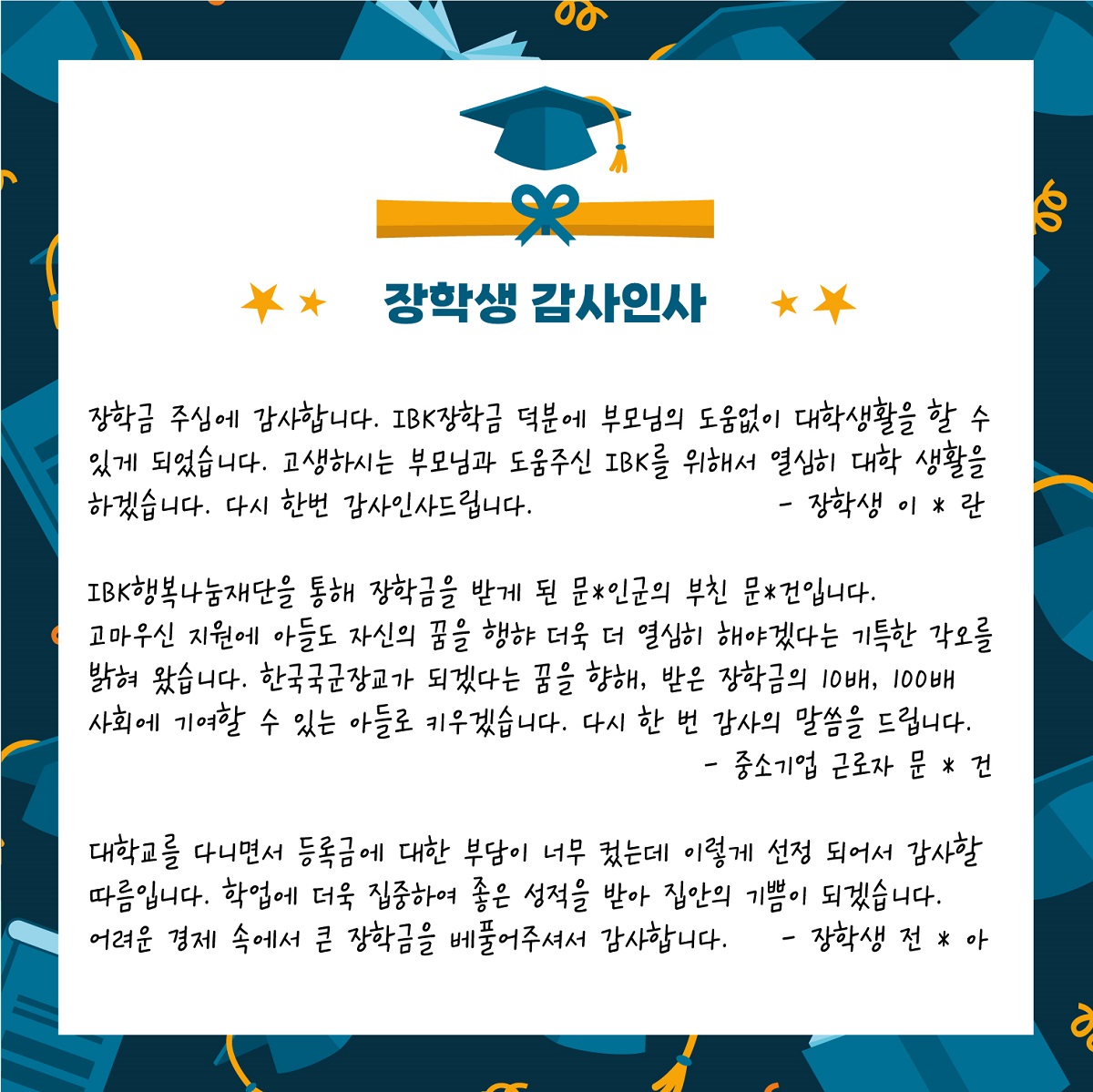 IBK 행복나눔재단 재단소개 재단소개 진정성 있는 나눔 실현을 위해 다양한 사회공헌 활동 수행 인사말 소개 연혁 이사진 조직구성 투명경영 재정보고 경영보고 규정 찾아오시는 길 주요사업 주요사업 진정성 있는 나눔 실현을 위해 다양한 사회공헌 활동 수행 IBK장학금 IBK치료비 IBK중소기업 공동직장어린이집 1호점(남동사랑) 2호점(구미사랑) IBK멘토링 IBK희망기부 IBK인재육성 프로젝트 IBK문화예술지원 IBK희망디자인 IBK희망나래 IBK다문화 사랑 IBK금융경제교육 IBK아이돌봄지원사업 기타사업 소식 소식 진정성 있는 나눔 실현을 위해 다양한 사회공헌 활동 수행 공지사항 언론보도 자료실 자료실 진정성 있는 나눔 실현을 위해 다양한 사회공헌 활동 수행 영상 사진 서식자료 FAQ 감사인사 감사인사 진정성 있는 나눔 실현을 위해 다양한 사회공헌 활동 수행 감사인사 로그인 | 회원가입 카테고리 사진 IBK행복나눔재단의 활동 사진입니다. H 자료실 재단소개 주요사업 소식 자료실 감사인사 사진 영상 사진 서식자료 FAQ 2022년 상반기 IBK장학생의 감사인사 2022-07-08 가비아 조회수 : 371 이전글 2022년 상반기 IBK장학생의 감사인사 다음글 2022년 상반기 IBK치료비 지원 목록 비밀번호확인 * 확인